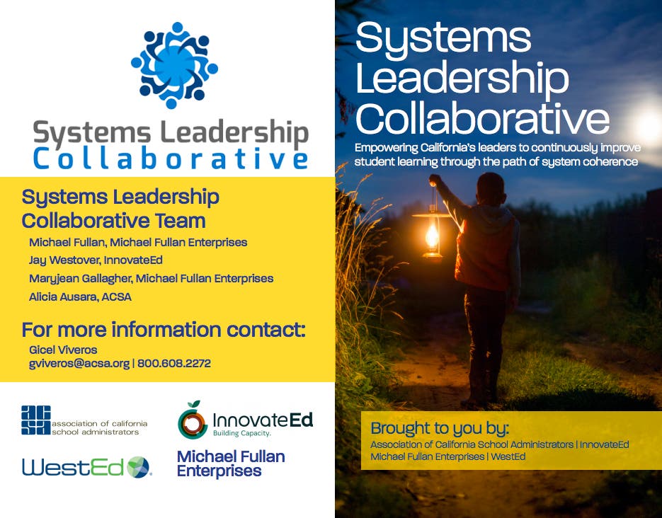 Systems Leadership Collaborative is lead by ACSA, Fullan, InnovateEd, The Flippen Group, and Fagen, Friedman and Fulfrost.
