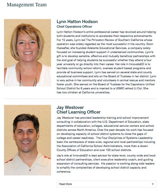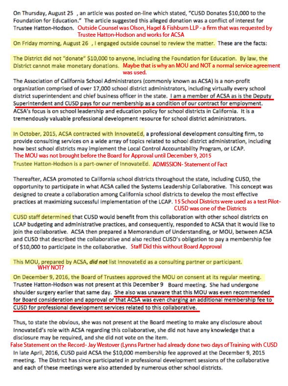 Note: InnovateEd was an integral partner in ACSA's plan for California's vision of California Education under Local Control. Trustee Hatton- Hodson used CUSD as a guinea pig for her business interests and greatly influenced CUSD decisions on the LCAP, Local Control, purchasing, contracts and professional development. Her business InnovateEd has grown from less than a million dollars into a multi-million dollar education empire.