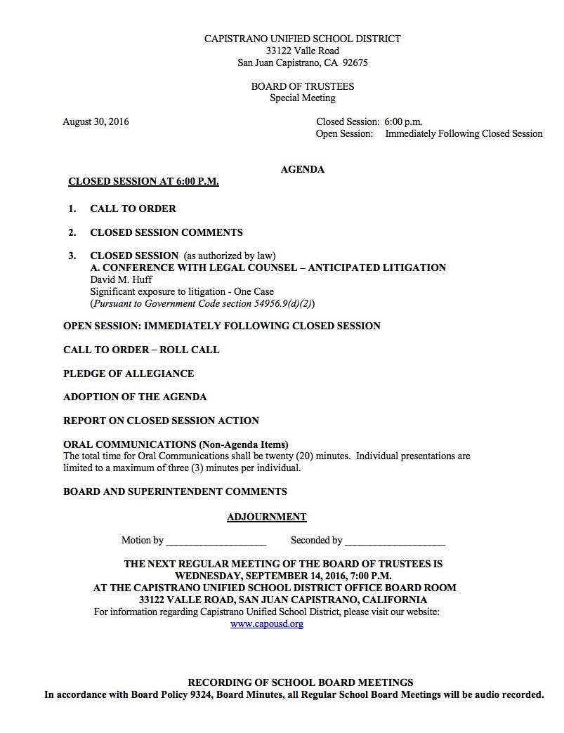 August 30, 2016 CUSD Board Meeting Agenda