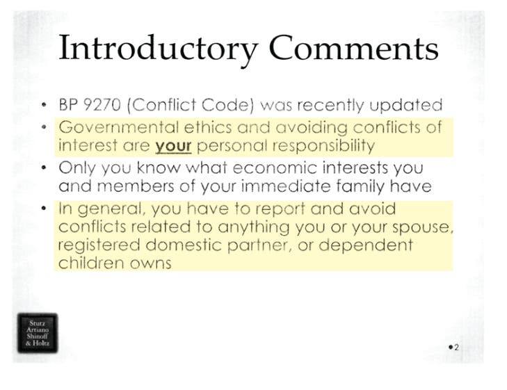 Board Policy 9270 clearly states that "Governmental Ethics and avoiding conflicts of interest are your personal responsibility".