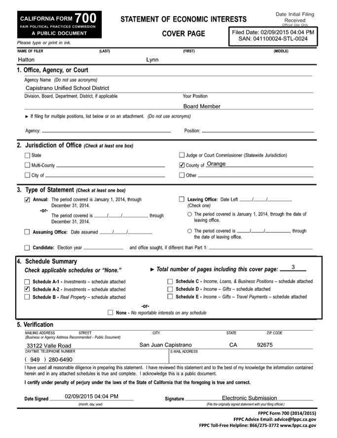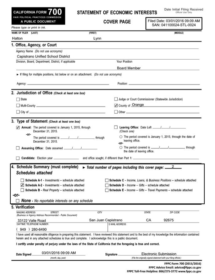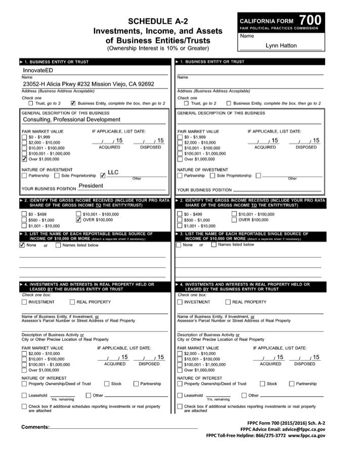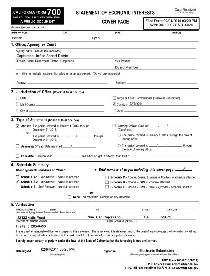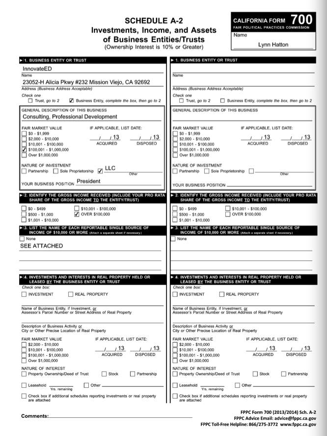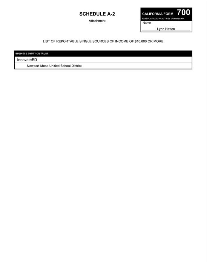 See Article: Trustee Hatton-Hodson's Form 700 Statement of Economic Interests