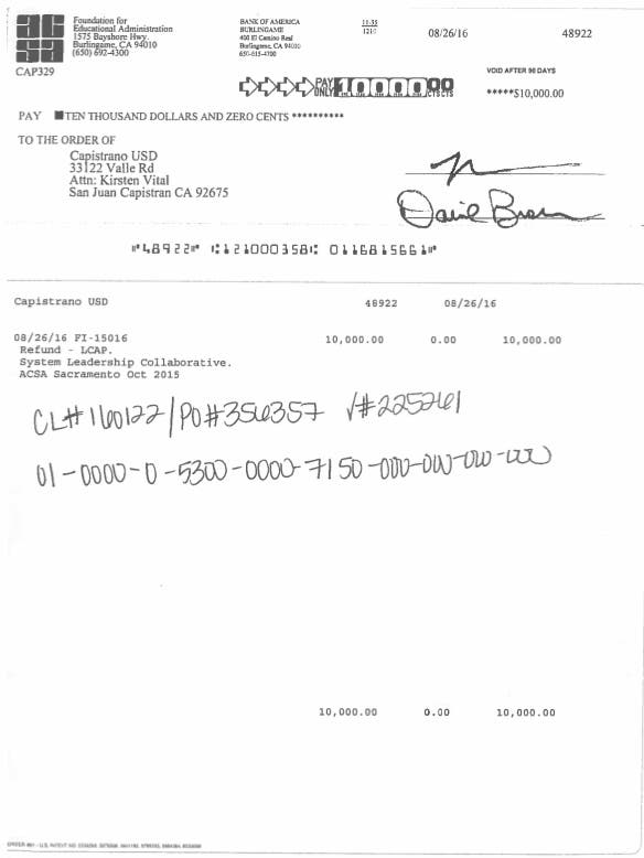 September 15, 2016 Article CUSDs' $10,000 Donation to ACSA/Foundation for Education is to be refunded to avoid the "Appearance" of Conflict of Interest.