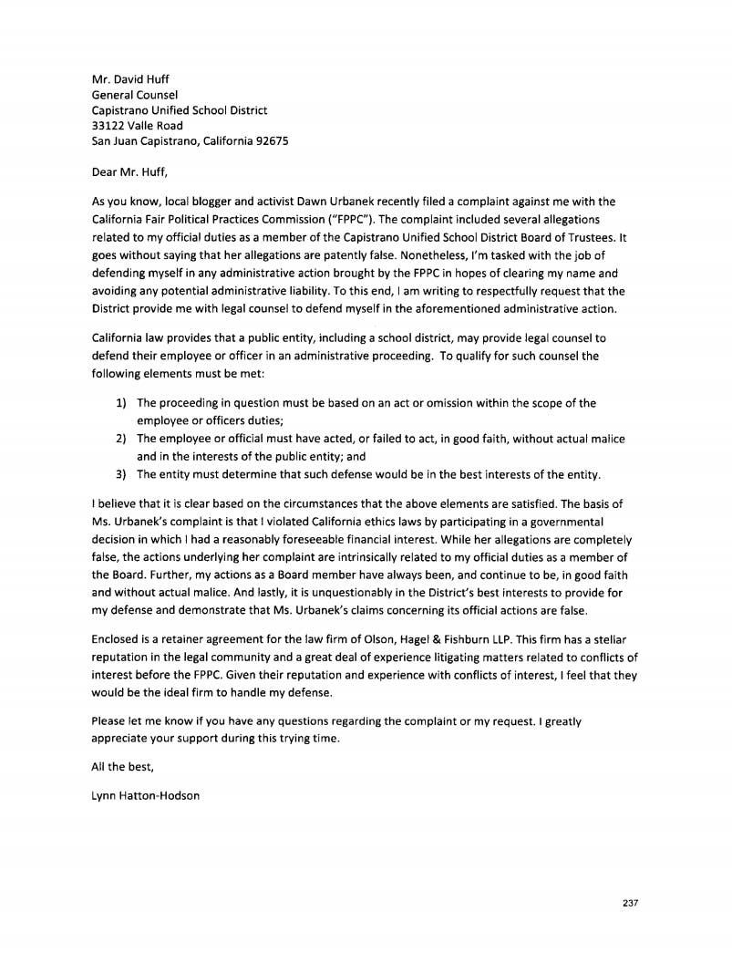 In an un-dated letter Trustee Hatton- Hodson makes a request for CUSD to hire a specific law firm.