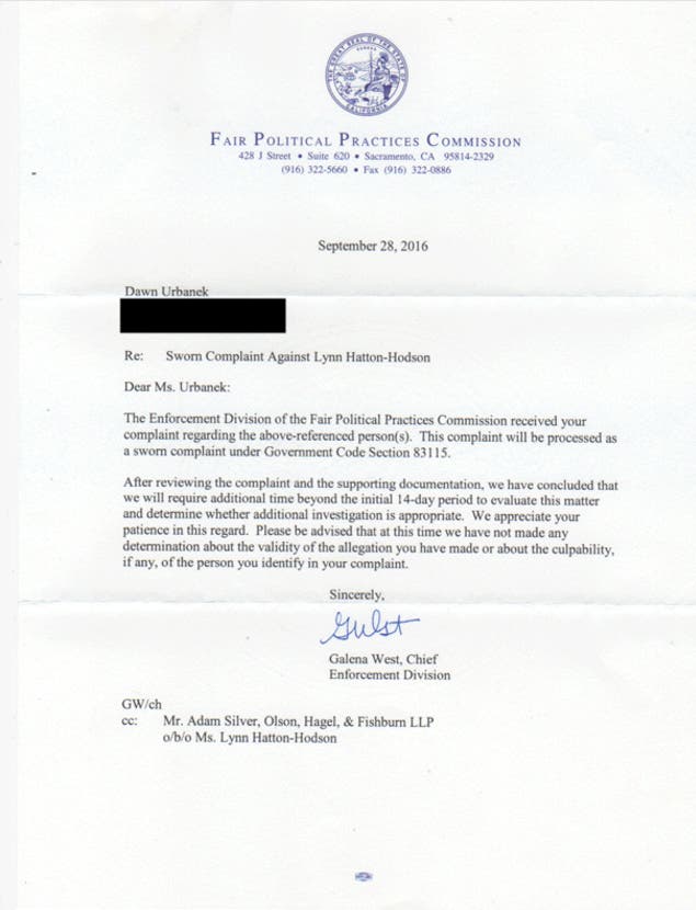 September 28, 2016 Fair Political Practices Commission Acknowledges Receipt of Sworn Complaint Against Trustee Hatton-Hodson