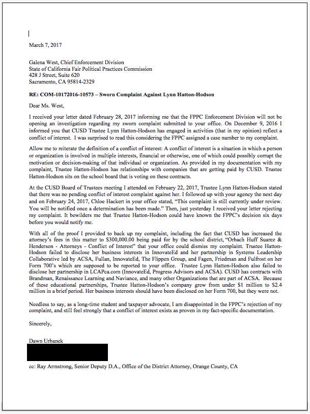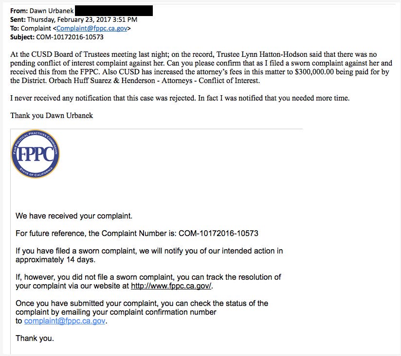 PART 3 The Conflict of Interest Investigation Takes a Very Odd Turn February 22, 2017 CUSD BOT MeetingBoard Audio at 56:02 Trustee Hatton-Hodson makes a statement from the Dais that there is no investigation currently. Trustee Hatton- Hodson Lies from the Dais:"There is NO Pending Conflict of Interest Case Against Her."February 23, 2017 E-mail to FPPC re: Trustee Hatton-Hodsons' statement