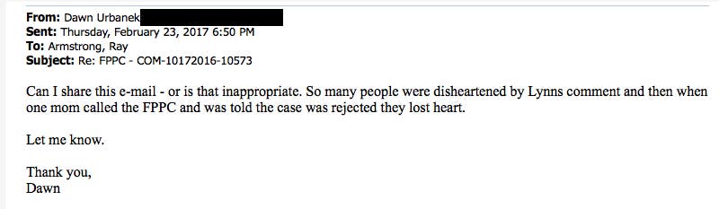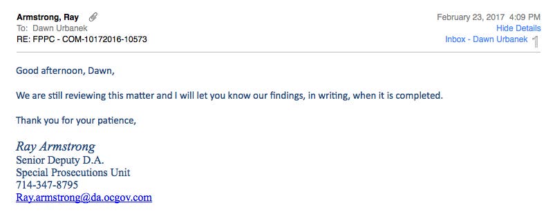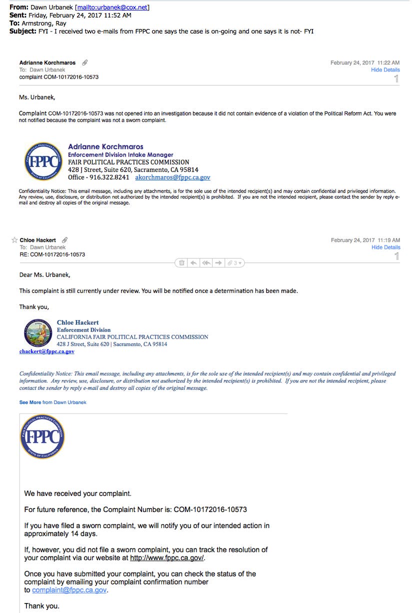 ![]() February 23, 2017 E-mail response from Special Prosecutor Ray Armstrong![]() Many People discredited all the work I had been doing because of Trustee Hatton-Hodsons lie from the Dais. The only way to restore my credibility was to verify that there was still an ongoing investigation.February 23, 2017 E-mail to Special Prosecutor Ray Armstrong asking if I can share his response.![]() February 23, 2017 E-mail response from Special Prosecutor Ray Armstrong![]() Two Different Responses from Fair Political Practices Commission within Minutes of Each OtherFebruary 24, 2017 E-mail from Chloe Hackert FPPC at 11:19 am![]() February 24, 2017 E-mail from Adrianne Korchmaros FPPC at 11:22 am![]() February 24, 2017 E-mail to Adrianne Korchmaros FPPC at 11:30![]() ![]()