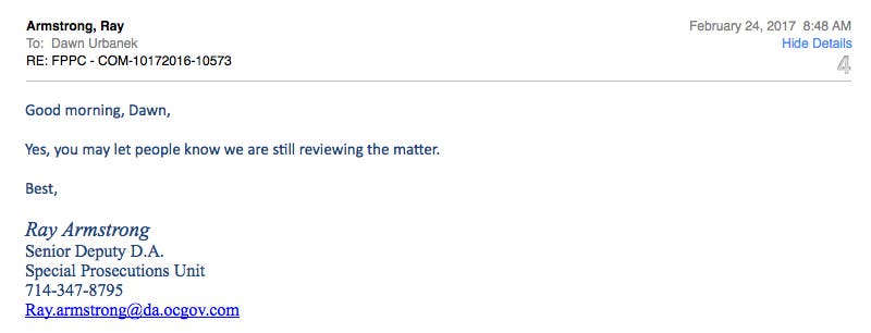February 24, 2017 E-mail to Special Prosecutor Ray Armstrong re: Receipt of two responses from FPPC
