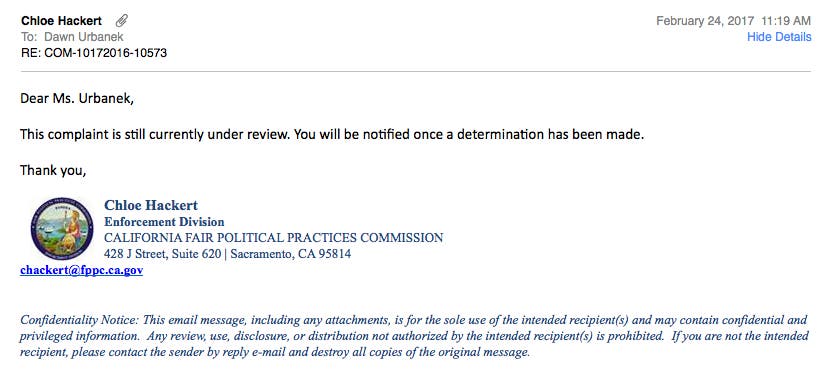 September 7, 2016 A Fair Political Practice Complaint was filed.
