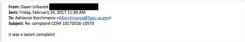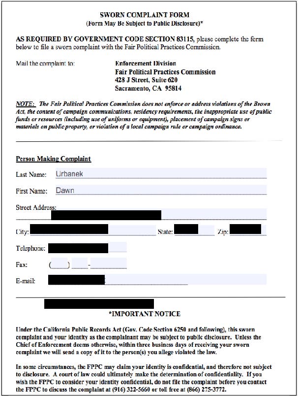 Fair Political Practices Commission Acknowledges Receipt of Sworn Complaint