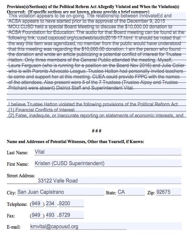 | At the September 28, 2016 Board Meeting Superintendent Vital read a Statement from CUSD Legal Counsel regarding possible Conflict of Interest charges against Trustee Lynn Hatton-Hodson. Board Audio at 192:58 "Our legal Counsel has opined that pursuant to BP 9270(b) the Board of Trustees are "designated employees and must disclose all categories defined. Therefore Trustee Hatton-Hodson is a designated employee for the purposes of filling out a Form 700 therefore this is a part of her scope of employment therefore she is entitled to defense under Government Code and Board policy. On advice of council the school district must respond to Trustee Hatton Hodson’s request for legal defense on or before October 16, 2016 and if it declines the defense, the Board must provide the basis for doing so per Government Code Section 995." Note: CUSD changed its Conflict of Interest Policy to Protect Trustee Hatton-Hodson. Source: Orange County Superintendent of Schools - California Law Governing Conflict of Interest California's conflict of interest statutes are based on the belief that a public official cannot serve two masters simultaneously, and that the duties of the public office demand absolutely loyalty and undivided, uncompromised allegiance of the individual that holds the office. People v. Honig (9196) 48 Cal.App.4th 289; Thomas v. Call (9185) 38 Cal 3rd 633) Two laws govern potential conflicts of interest for school district employees and board members: