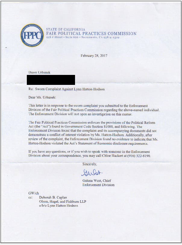 - A case was opened. I never received a letter from the FPPC stating that there was no case until AFTER Trustee Hatton-Hodson announced that there was no case from the Dais at a board meeting.