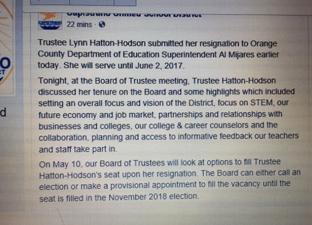 Note: She gave her letter of resignation to the County Office of Education- shouldn't it have gone to CUSD?