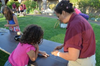 When we arrived at the Mission, they checked us in and had carts and wagons to help us get our tent and gear in. I asked my niece where she wanted to pitch our tent. She saw a monarch butterfly fly by and decided that that was where she wanted to be, so we pitched our tent and headed over to dinner. After a dinner from Ciao Pasta, she wandered over to the activities area while I lingered a bit with new acquaintances Phil and his wife Gloria. When I made it over to the activities, I was there in time to see her excitement over finding gold at the panning for gold table. She had already made her own adobe brick and I chose not to get my hands muddy, so I skipped that table. We both chose black arrowheads for our arrowhead necklaces although we went two completely different routes on the beads we used to finish them off. (Of course, as I was informed, hers is much prettier than mine is.) At the games table, we kept tying at Tic-Tac-Toe, so she decided to try the stilts. As long as Aunty held her, they were fun, but as soon as Aunty let go….. Not sure of the name of the game, but she chased a wooden hoop around with sticks, much like I remember seeing pictures of girls in pinafores doing in years of yore. Aunty stood back laughing and taking pictures, smart enough to not even try. I also took a fun video of her doing a potato sack race with a burlap bag. And lest I forget it, she got to make her own rope! They made it so she could lasso things and I reminded her no lassoing people, especially bro-bro!!!