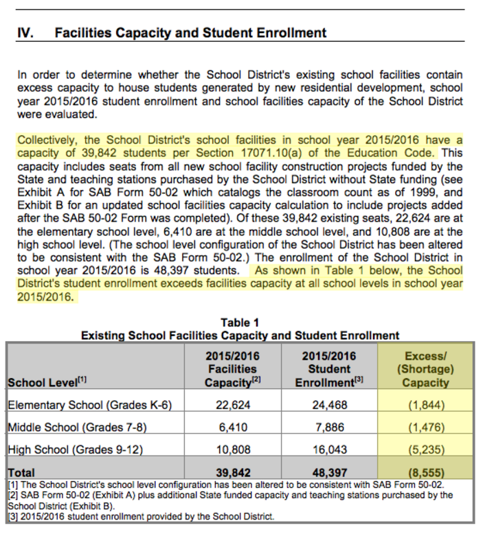 In March of 2016 CUSD did a "Residential Development School Fee Justification Study" which showed that the CUSD's student enrollment exceeded facilities capacity at all school levels in 2015- 16.
