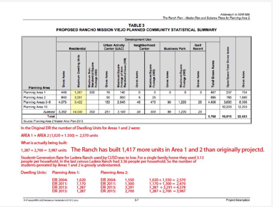 No new schools have been built and the latest 2015 EIR shows that the number of dwelling units in planning Areas 1 and 2 has increased substantially and that the number of students that will be generated from Sendero and Escencia may be grossly understated.