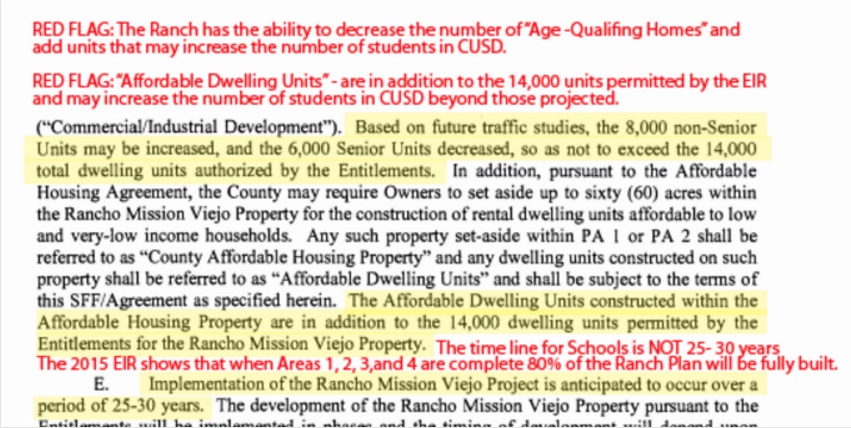 The Ranch has obviously loaded more units into Areas 1 and 2 then originally planned. It should also be noted that the Ranch has added Affordable housing units. According to the 2015 EIR these units are not included in the 14,000 maximum dwelling units. Adding Affordable Housing Units allows the Ranch to exceed the 14,000 maximum.