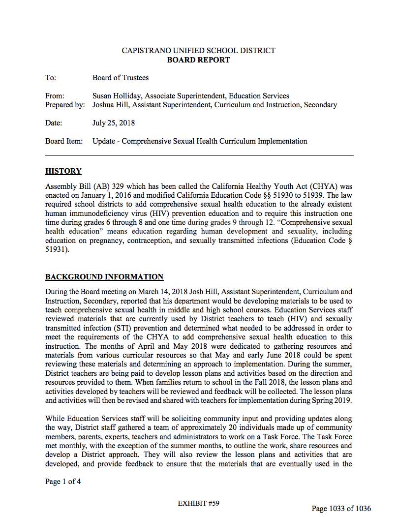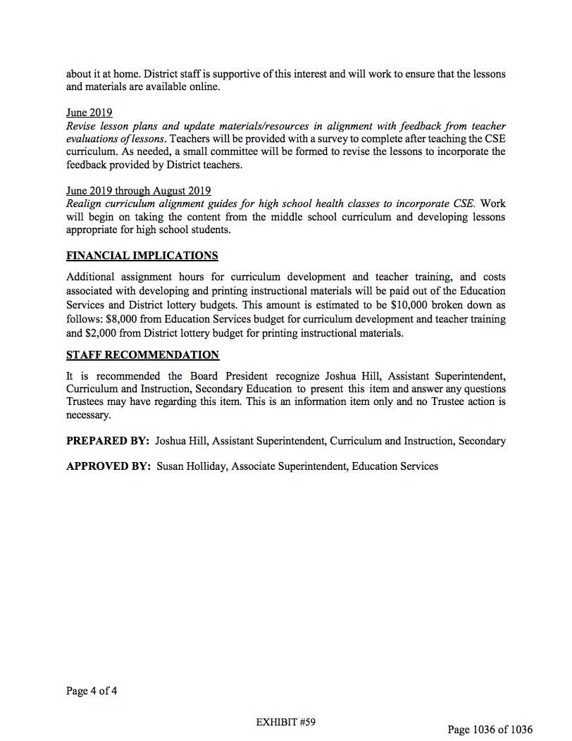 Board Audio at 22:20 Michelle McNutt Nurse and "progressive sex positive parent" who sits on the Sex Education Task Force Team. Advocate for Teen Talk. A handful of Task Force members wanted to rewrite curricula to include abstinence only until hetrosexual marriage lessons. This new curriculum is called SRA "Sexual Risk Avoidance". SRA lessons are illegal in the State of California. Was oppose to Pragger U video called "Gender Identity, Why all the Confusion?" Concerned about the legitimacy of the task force. These members are not here in good faith. Please do not let the personal beliefs of a fear mongering groups derail efforts to implement CHYA (California Healthy Youth Act)