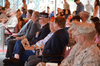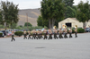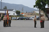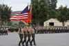 The First Marine Regimental Band provided the day’s musical accompaniment (and caused me a burning desire to go home and dig out my Sousa CD’s). However, it was also a bit disappointing… no bagpipes this time around. I have heard our national anthem played countless times, and while I will not say this was the most moving version I have ever heard (I think that was the first time I heard it after 9/11), it was pretty special. This was just one regiment changing commanders, but for the rest of Camp Pendleton, it was a business as usual day. While the anthem was played, you could hear “bombs bursting in air” in the background… along with some sporadic gunshots and helicopters flying by. It was only a very small amount of firepower, but it gave one a hint of what Francis Scott Key might have been thinking of while writing our anthem. Several people spoke, including both of the Lieutenant Coronels, and all spoke highly of San Juan. (My fellow citizens, you would have been proud!) After all the remarks, the batteries passed by in review. They played Waltzing Matilda, Anchors Away (because, as it was pointed out to me by a Navy man in attendance, the Marines are a branch of the Navy) and lastly the Marines Hymn.
