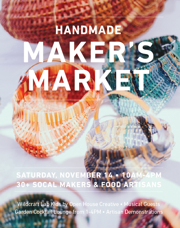 Explore 30+ SoCal makers and food artisans, everything from hand woven baskets, clothing made with natural dyes, handmade furniture, local art, handmade herbal soaps and more. Plus, enjoy fun activities such as Wildcraft Lab Kids, Garden Cocktail Lounge, musical guests & artisan demonstrations.
