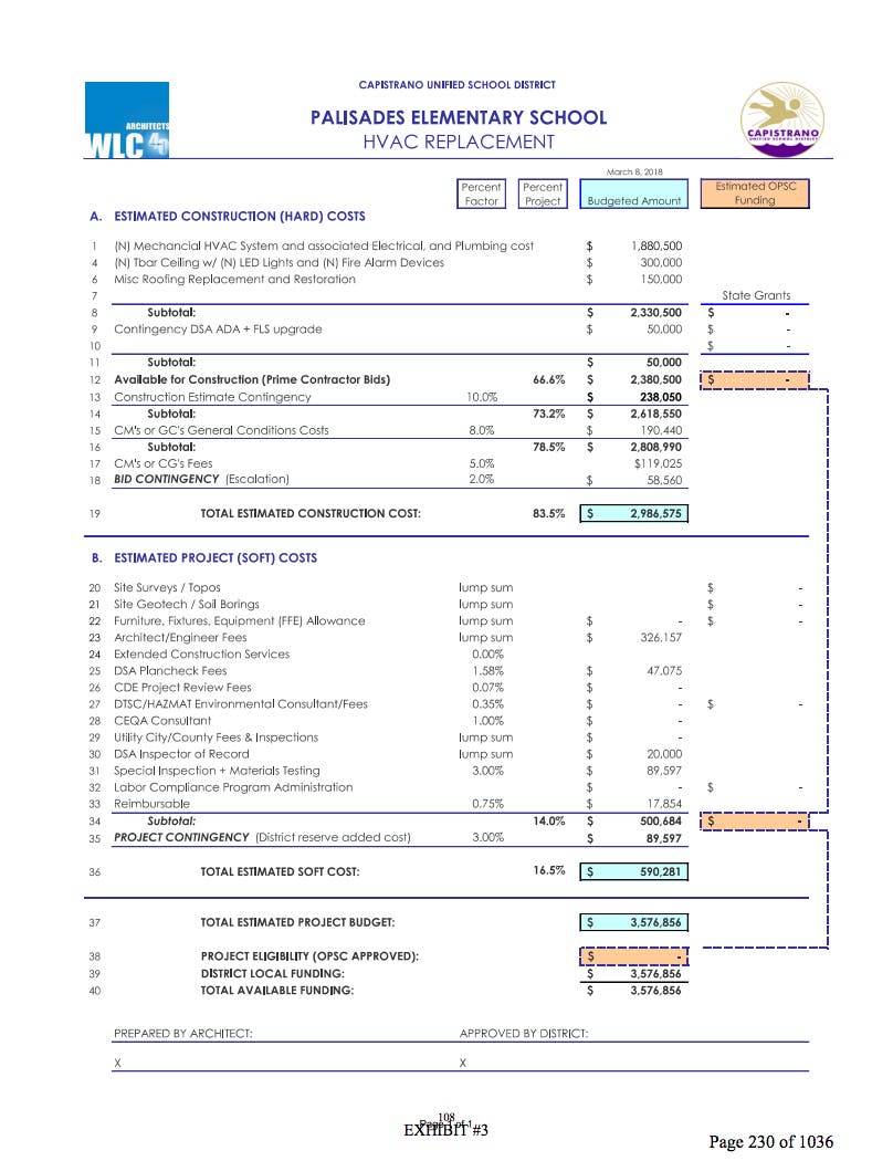 Board Agenda at page 230 "Palisades Elementary School HVAC Replacement Estimates state the total project cost is $3,576,856.00