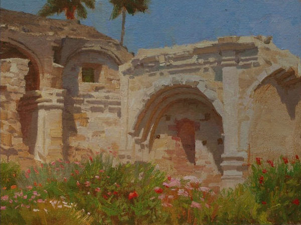 The nearly 40 paintings represent new works created during and inspired by the organization’s eight-month project to “Paint the Missions. To mark the 300th anniversary of the birth of Father Junipero Serra (1713-1784), the Club coordinated “paint-outs” at five missions and encouraged artists to visit and paint at the remaining 16 missions in the state. At these painting events, artist members set up their easels to paint the historic monuments and their surrounding grounds “en plein air” (in the open air).