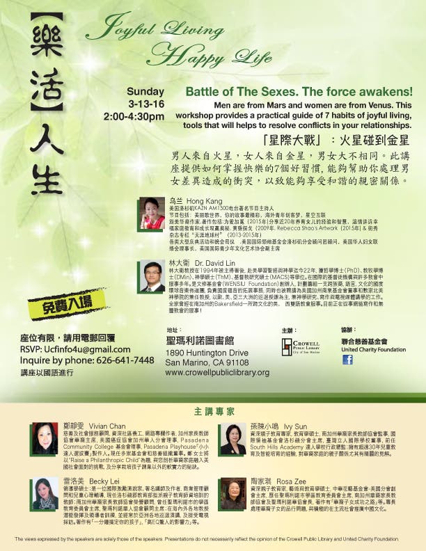 "Joyful Living Happy Life" Lecture series at San Marino Crowell Public Library.