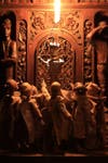 The astonishing dream-like quality of the realm on view reflects and enforces the elusive nature of meaning. A cast of about three dozen distinct, handcarved characters populate three dark gallery rooms, lighted in such a way as to draw your attention only to the art.
