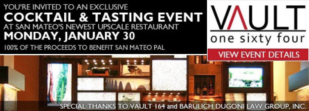 Please join the San Mateo Police Activities League (PAL) for an exclusive cocktail and tasting event at San Mateo's newest upscale restaurant, Vault 164. Housed in the historic Crocker Bank building, Vault 164 features contemporary American cuisine, a stunning bar, and is the latest enterprise from Bay Area restaurateur Dennis Berkowitz and family.