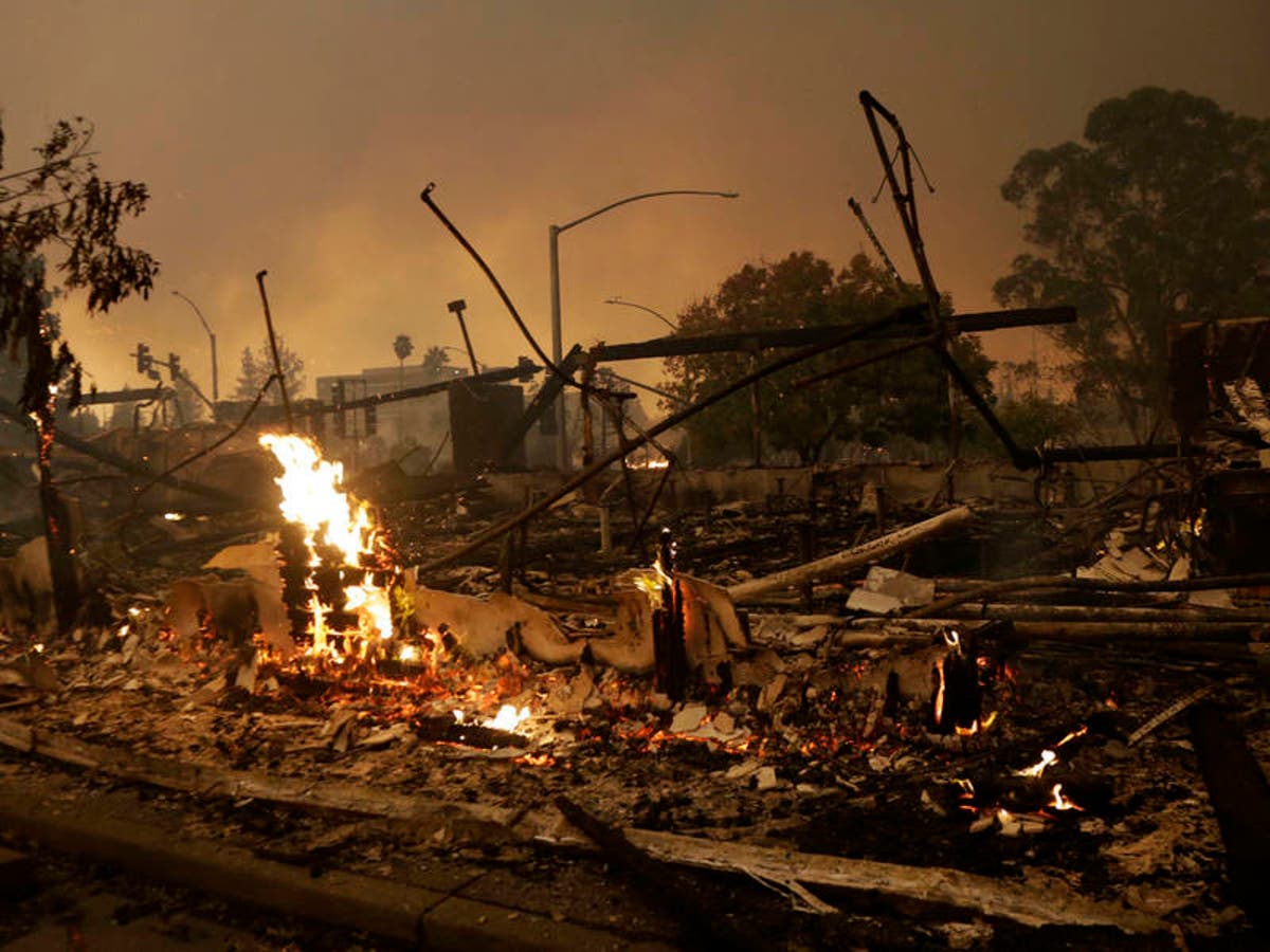 Flames rise from the remains of a burned down commercial building in Santa Rosa, Calif., Monday, Oct. 9, 2017. (Jeff Chiu/Associated Press)