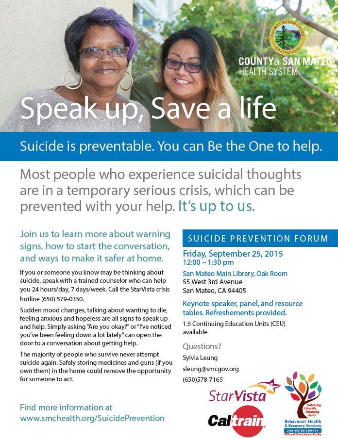 SUICIDE PREVENTION FORUM Friday, September 25, 2015 12:00 – 1:30 pm San Mateo Main Library, Oak Room 55 West 3rd Avenue San Mateo, CA 94405
