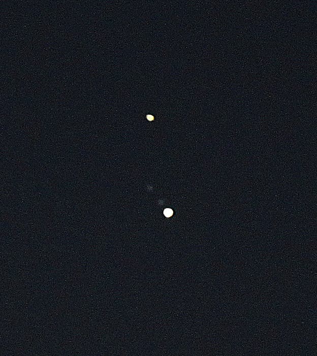 "Jupiter is the lower bright one and Saturn is the upper bright one," he said. "Saturn appears elongated because of the rings. Two of Jupiter's moons can be seen faintly at the left."