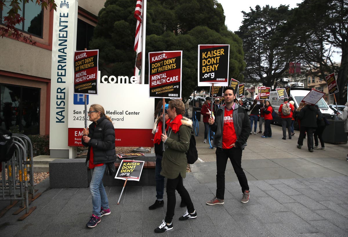 Photo: Kaiser Permanente mental health workers carry signs as they march in front of Kaiser Permanente San Francisco Medical Center on December 10, 2018 in San Francisco, California. Nearly 4,000 Kaiser Permanente mental health workers with the National Union of Healthcare Workers union kicked off a five-day strike at Kaiser facilities throughout California. The union says that they are protesting the lack of staffing that forces many patients to wait for a month or more for appointments. (Photo by Justin Sullivan/Getty Images)