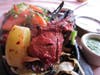The quick-roasted chops, wreathed in billows of steam, are presented on a cast iron platter over a bed of sizzling onions, green peppers and tomato chunks. An order of garlic naan on the side ($4.25) makes for a near-perfect dinner. Sop up the juices with the bread; make a little sandwich with those savory vegetables, wilting into a bronzed tastiness as you gnaw away.