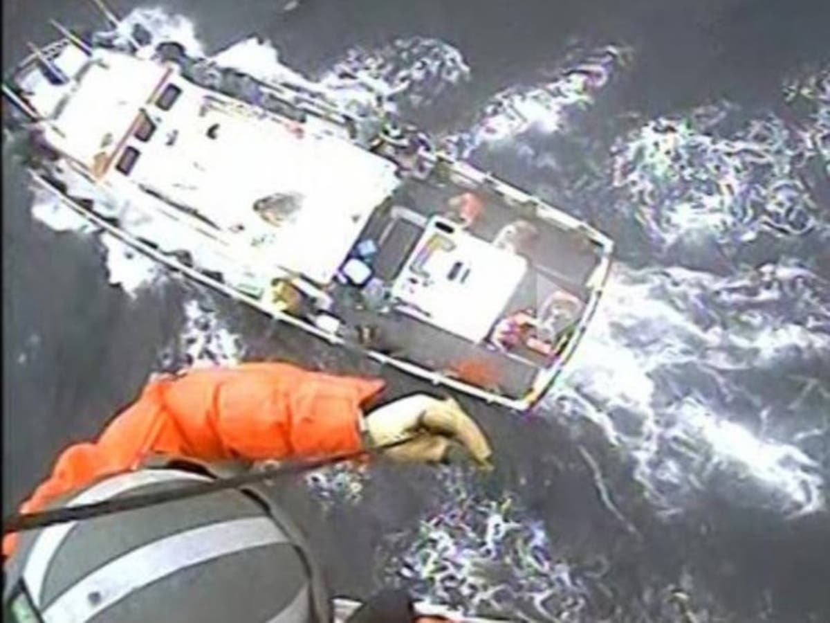 The helicopter crew lowered a rescue swimmer, Petty Officer 3rd Class Taylor Paul, onto the fishing boat. Paul then hoisted the patient into the helicopter.