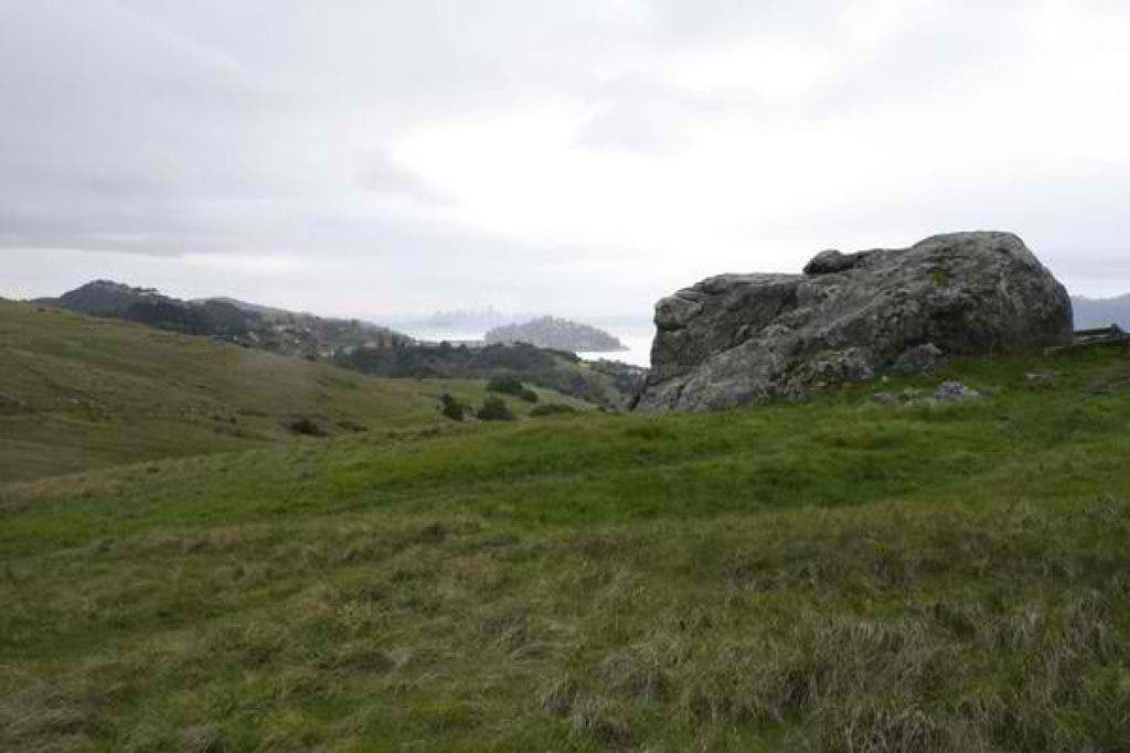 The trail is alternately rocky and muddy, so bring your grubbiest shoes. Once on the ridge, the views are tremendous. San Quentin Penitentiary dominates the northern view, while the east bay hills and Mt. Diablo lie to the east. The views of the city to the south and Mt Tam to the west fill out the visual scenery. In the foreground, large hummocks of oaks and bays wrapped around huge serpentine boulders draw you to explore their protected nooks and crannies.