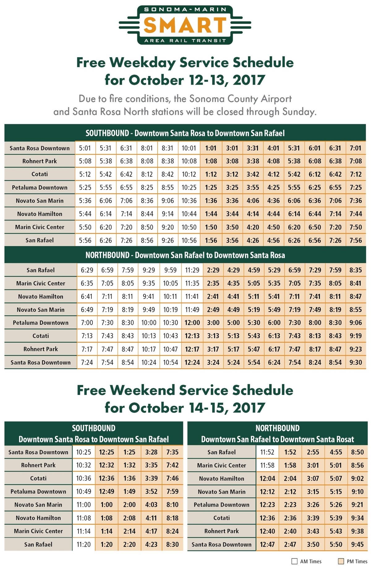 SMART's Thursday and Friday and weekend schedules are below. Passengers are encouraged to check www.SonomaMarinTrain.org to ensure there are no schedule changes due to changing fire conditions.