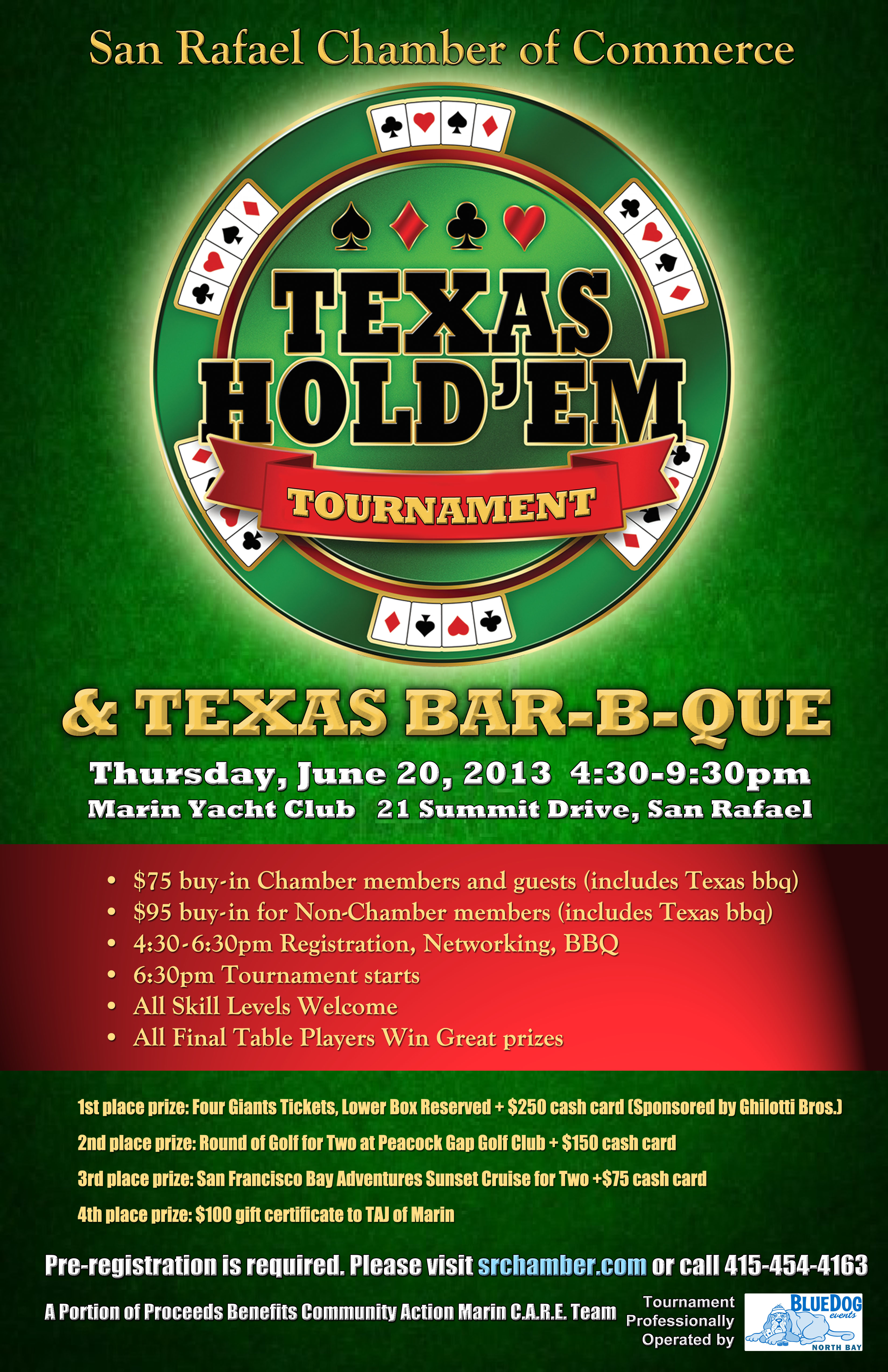 The San Rafael Chamber of Commerce announces our Texas Hold'Em Poker Tournament & Texas BBQ! You don't have to be a seasoned poker player to join in the fun! Place your bets on the future of those that need us the most. Proceeds will benefit Community Action Marin C.A.R.E. team: helping the homeless mentally ill find the resources they need.