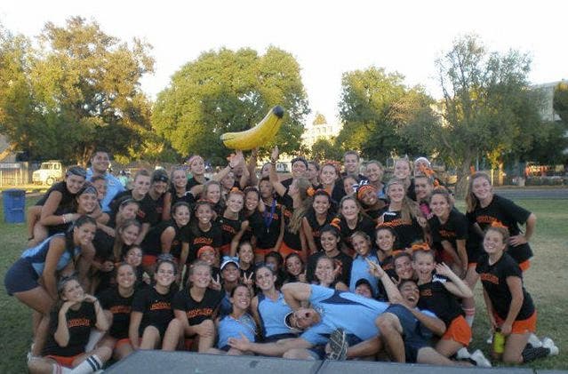 Not only did the cheer squads from Cal demonstrate their skill, but they also showed their collective team enthusiasm at the UCA camp. While in Davis, both the varsity and junior varsity competitive teams were recognized by the Universal Cheerleaders Association in receiving the coveted "Top Banana" award for demonstrating extraordinary team spirit at the four-day UCA Elite event.