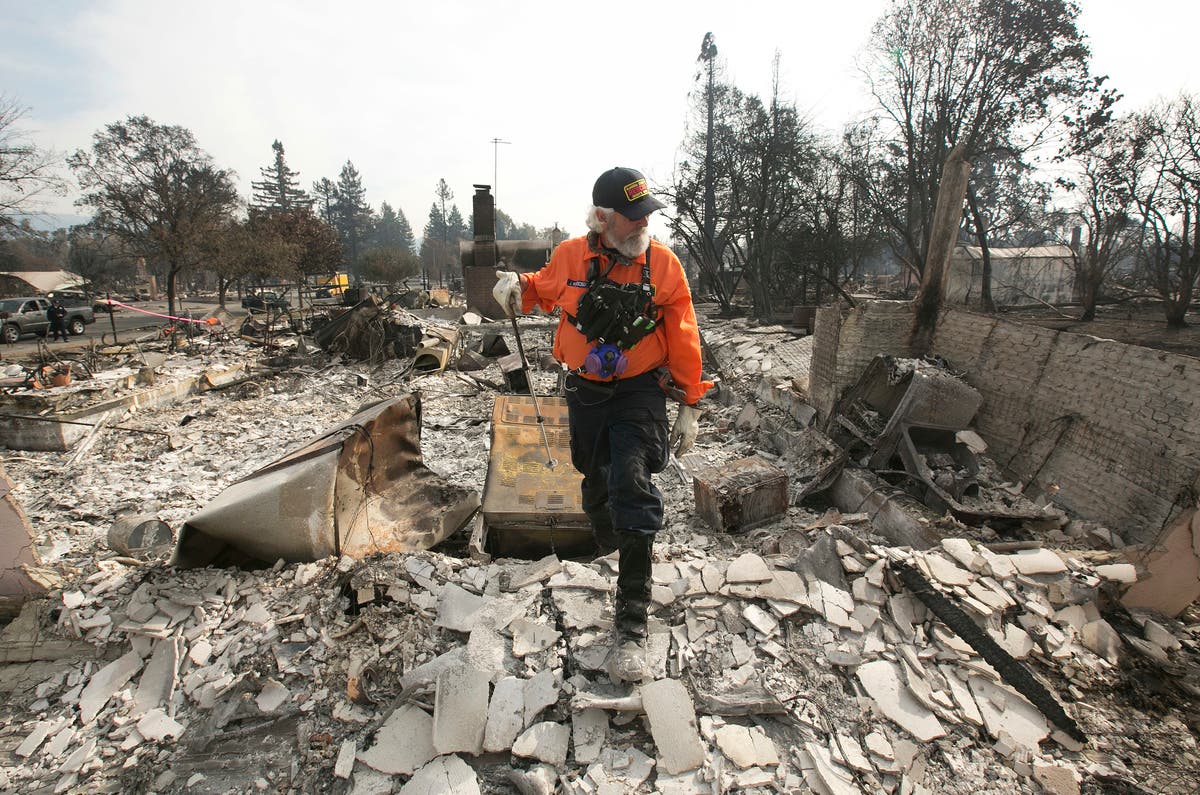 IMAGE: J. Petrocelli of the Alameda County Sheriff's Office Search and Rescue walks through the burned out remains of a home while searching the Coffey Park area Tuesday, Oct. 17, 2017, in Santa Rosa, Calif. / CREDIT: Rich Pedroncelli / Associated Press