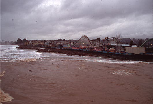 Photo: The San Lorenzo River flows into Monterey Bay in front of the Boardwalk during El Nino storms in 1998. Credit: USGS