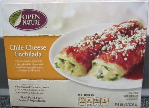 Open Nature Chile Cheese Enchiladas are a frozen prepared dinner packaged in a box with a net weight of 9 oz. and marked with a UPC 0-7989310436-9. The product was sold at stores from Oct 9, 2014, through December 1, 2014. The packages have the lot number 141006 and the “best by” date of AUG-06-15.