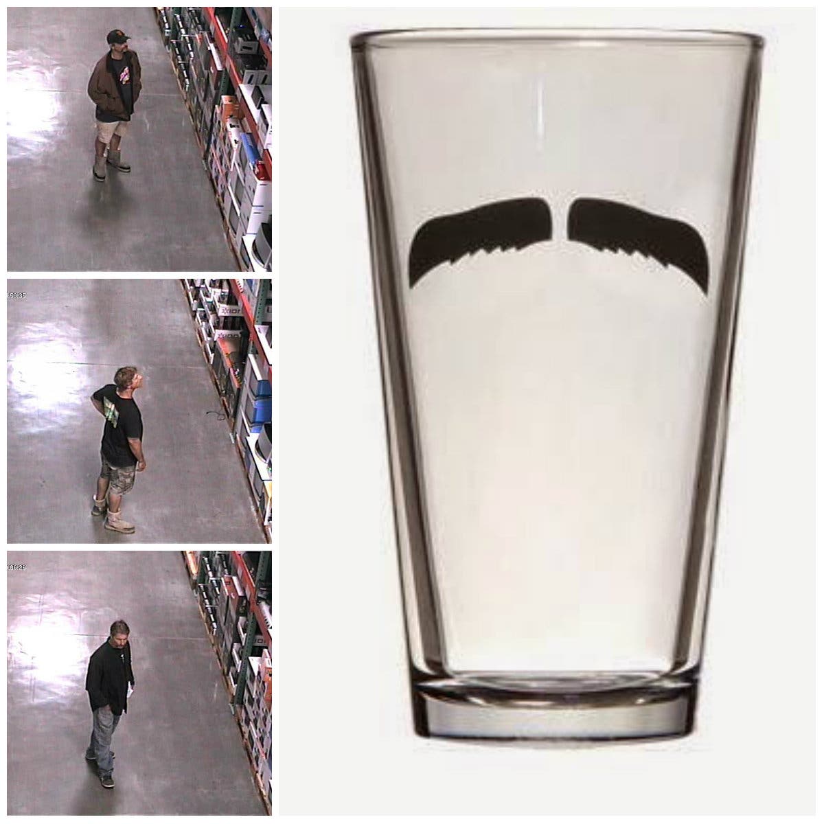 And the reward to the person who helps turn in the man of many disguises -- a commemorative glass with a painted mustache on it!