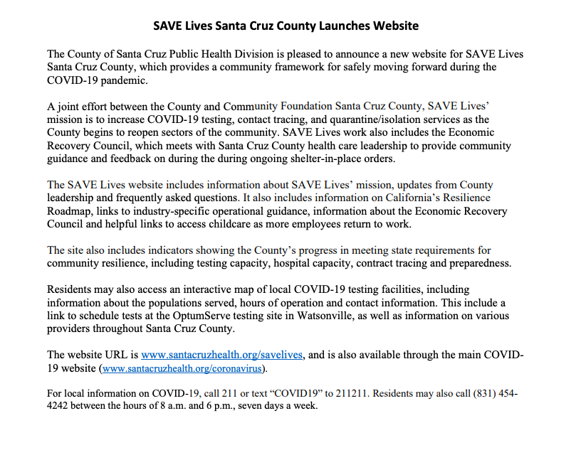 SAVE Lives Santa Cruz County provides a community framework for safely moving forward during the COVID-19 pandemic.