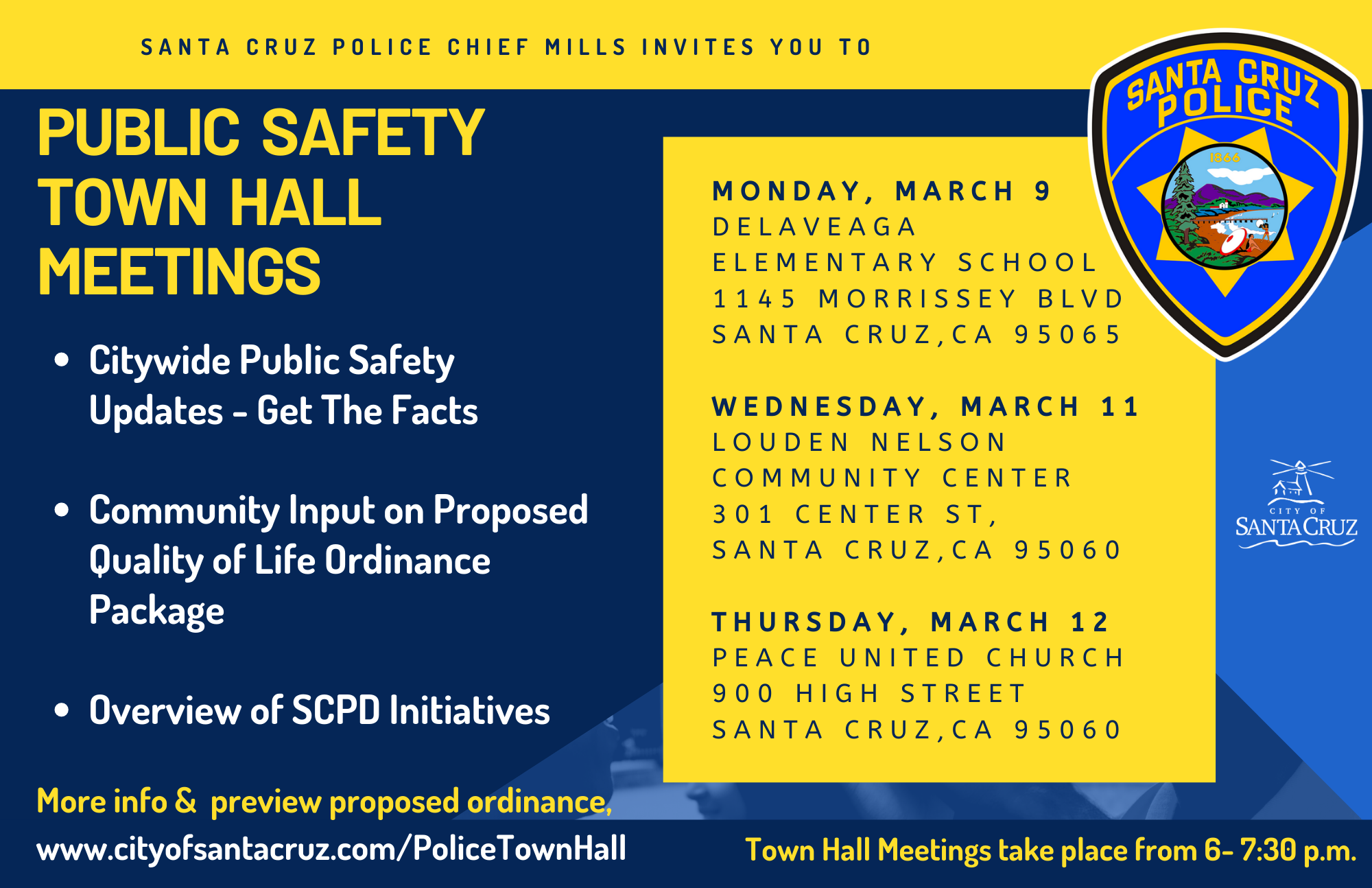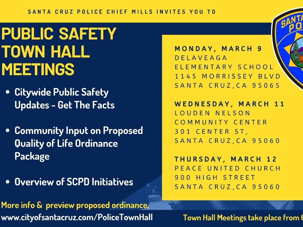 SANTA CRUZ —The Santa Cruz Police Department will host three Town Hall meetings in March to get feedback from residents on the proposed Public Safety Quality of Life Ordinance Package. The town hall series takes place on: