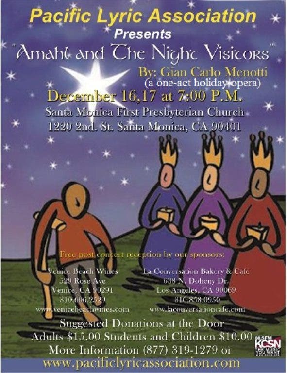 Pacific Lyric Association is proud to present the one-act Holiday Opera "Amahl and The Night Visitors” by Gian Carlo Menotti that will take place at the Santa Monica First Presbyterian Church located at 1220 2nd Street, Santa Monica, CA 90401 on December 16 and 17 at 7:00 pm. "Amahl and the Night Visitors" was the first opera specifically composed for television in America and was performed by the NBC Opera Theatre on December 24, 1951, in New York City at NBC studio 8H in Rockefeller Center, where it was broadcast live on television as the debut production of the Hallmark Hall of Fame. Please join us in the beautiful concert space of The First Presbyterian Church of Santa Monica, located downtown and within blocks of the beach, 3rd Street Promenade, Santa Monica Place and Santa Monica Pier. To cap this unforgettable evening, Pacific Lyric Association would like to extend all patrons an invitation to our after-concert reception featuring wine, beverages and dessert on the church's adjacent courtyard. Suggested Donations at Door: Adults $15 Seniors/Students/Children $10