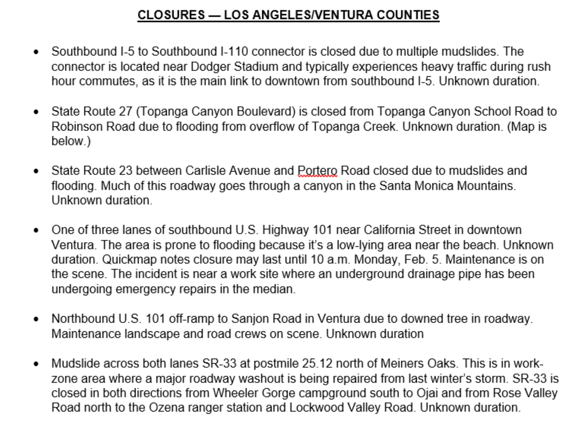 LOS ANGELES, CA — Portions of the San Diego (405) Freeway were closed in the Sepulveda Pass and Long Beach areas due to mudslides. Commuters are advised to expect delays and watch out for Caltrans workers.