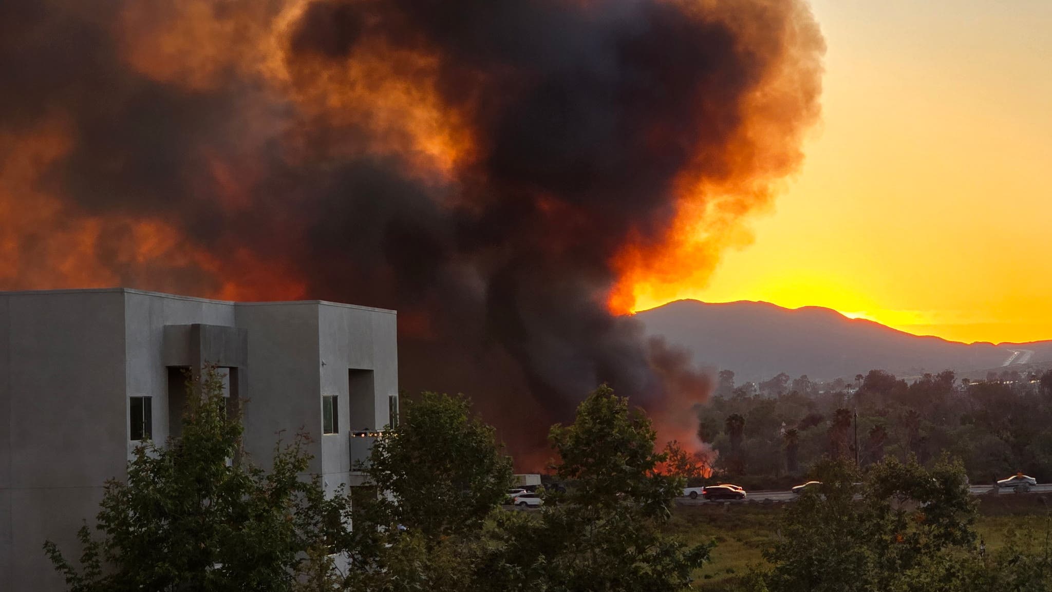 The fire was burning within 100 feet of businesses on the northern side of the San Diego River, according to Watch Duty.