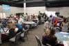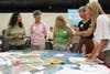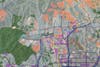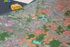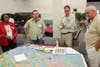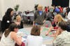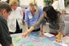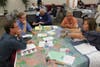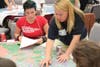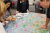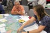 The second half, which winnowed down to about 50 people, involved a huge map of the region with color indications of developable land, used land, transportation and transit routes and public facilities. Groups of five to ten people gathered around the map and placed different colored sticky icons to indicate where they wanted new facilities, housing, transport and other developments in the future.