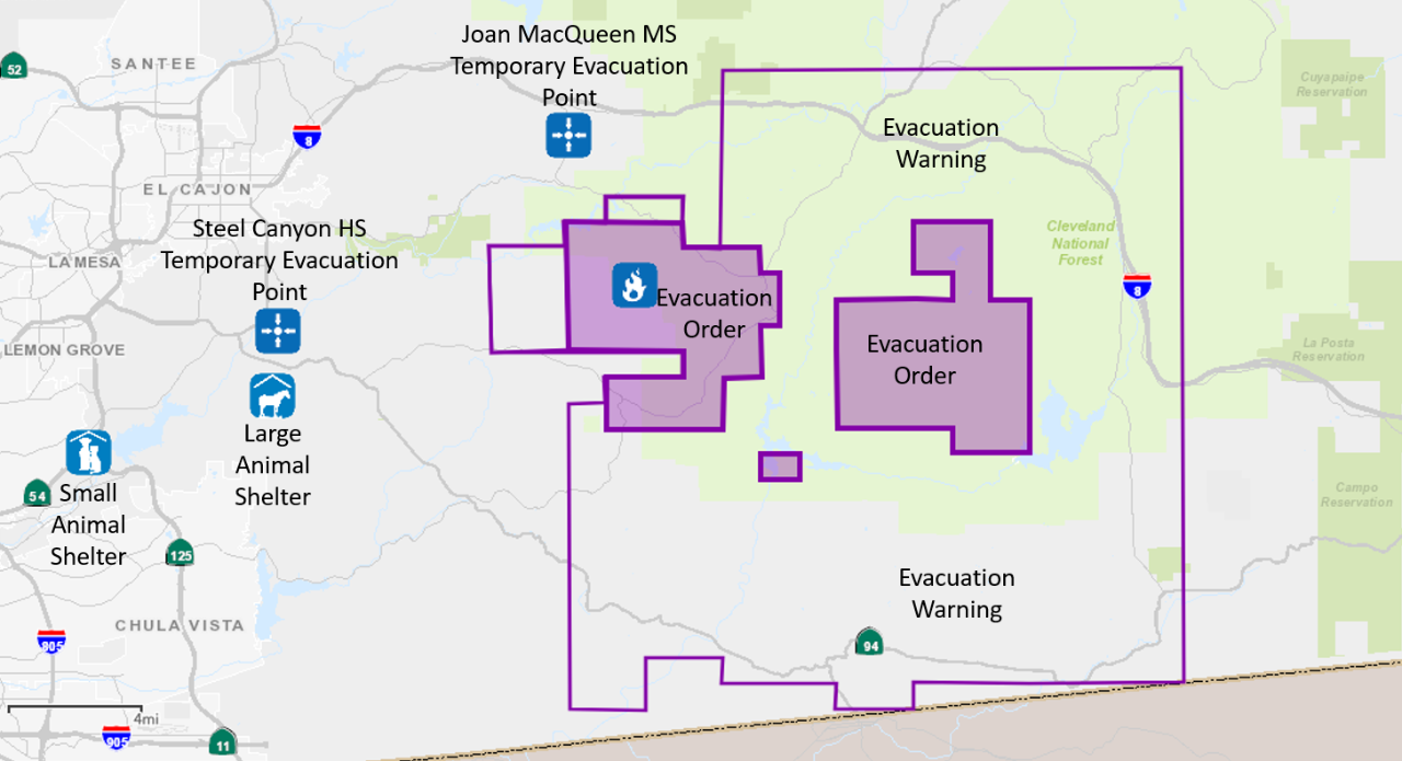 Evacuation centers have been opened at El Capitan High School at 10410 Ashwood Street in Lakeside and Steele Canyon High School at 12440 Campo Road in Spring Valley. The evacuation center at Joan McQueen Middle School has been closed due to capacity and sheltering needs, according to the county.