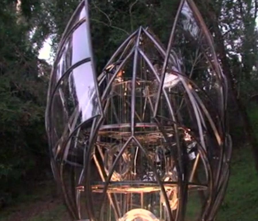 In the final sculpture, the three giant petals, intended to evoke a sun-seeking flower, would open at dawn every day to collect solar energy and close at night.
